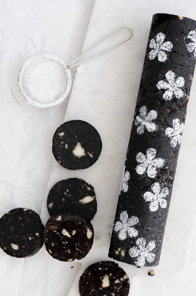 4. מגלגלים לנקניק (או מכדררים לכדורים), בוזקים אבקת סוכר מלמעלה (דרך סטנסיל אם רוצים לקשט כמו בתמונה) ושומרים בקירור.