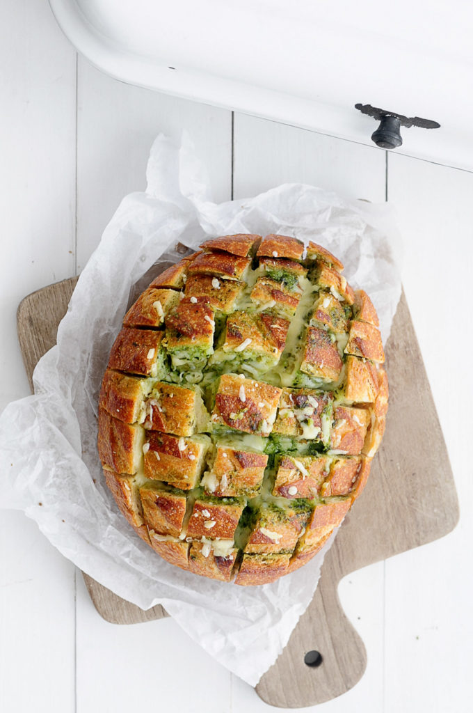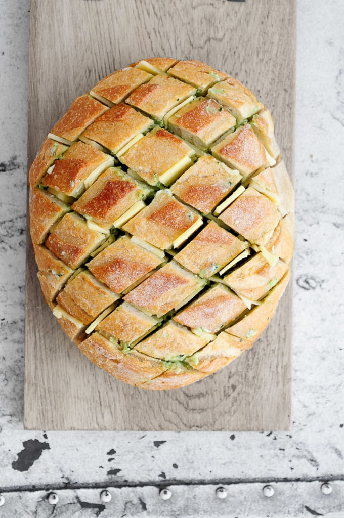 2. מערבבים בקערית חמאה, פסטו ושום ומורחים את הלחם בתוך החריצים, מכל הכיוונים.